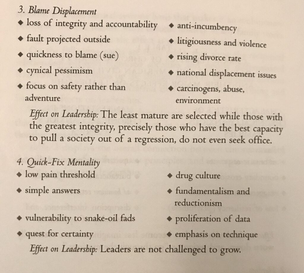 Chronically anxious families will seek out those professionals who promise the most comfort, not those who offer the most opportunities for maturation…The quick-fix attitude, therefore, will affect their choice of physicians, therapists, ministers, and politicians, as they are drawn to the snake oil of quick-fix elixirs that masquerade as technical solutions. (84)