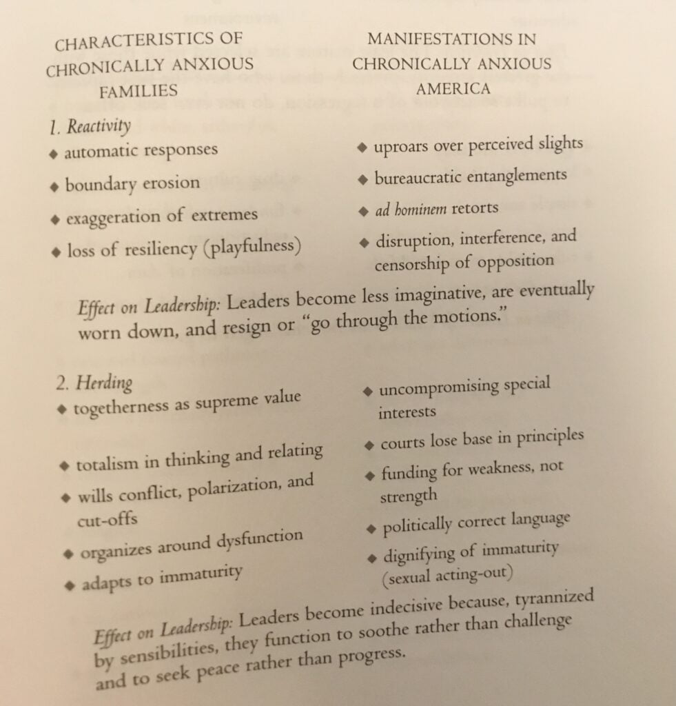 - A leader is not a dictator. He or she is rather someone who can maintain a ‘non-anxious, well-principled presence’. (89)